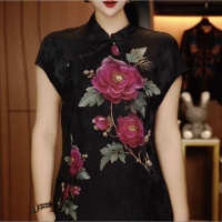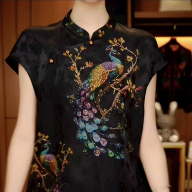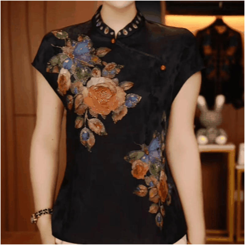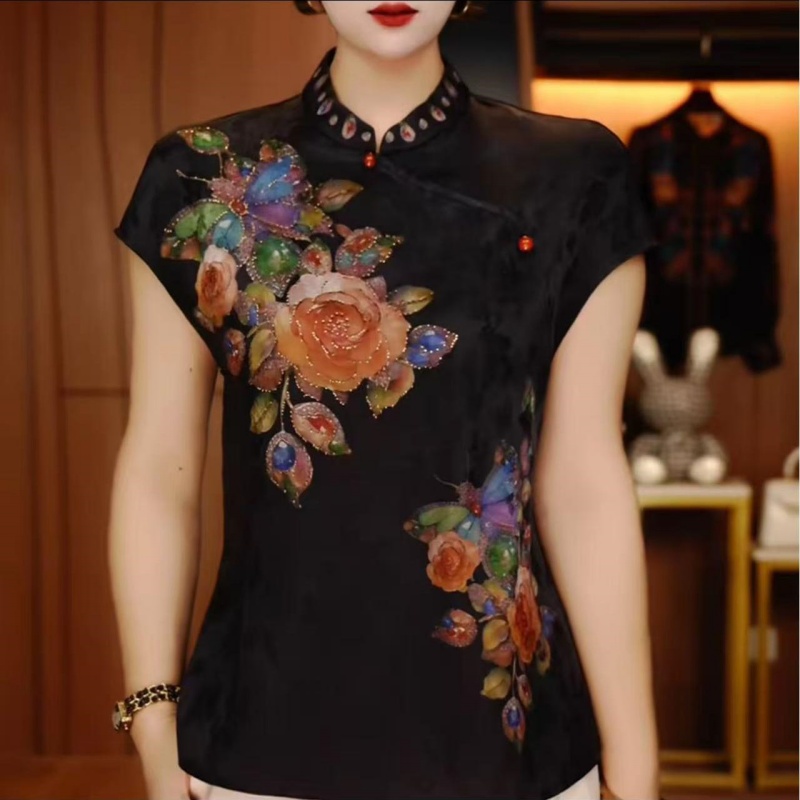 新中式旗袍領小衫太戳心 黑色底襯得牡丹印花顯貴氣 緞面質感夏穿透氣 衣櫃C位必須留給它